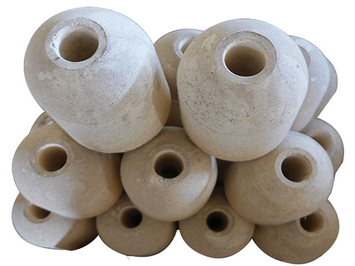 位于塞棒下端和水口磚呈嚴(yán)密配合的耐火材料質(zhì)磚。不澆注時(shí)它堵住水口保證不漏鋼。澆注時(shí)提高塞棒,使塞頭磚和水口磚產(chǎn)生間隙,鋼水從水口流出??刂迫舻母叩停烧{(diào)節(jié)鋼水的流出量。塞頭磚和棒芯間可用螺紋或銷子固定,分別如圖中a、b所示。塞頭磚可以是黏土質(zhì)、不燒高鋁質(zhì)及焦油浸漬的不燒高鋁質(zhì)磚。